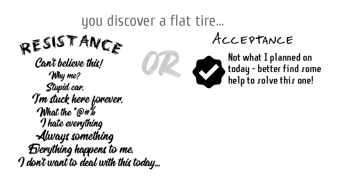 Often accepting what is happening is just plain tough. Noticing when we are resisting the moment and how this creates stress is the key. Without awareness, not much changes. The one thing we know is that whatever is happening is temporary. Once acceptance kicks in... the solutions kick in too! We see we have options and can begin taking action.